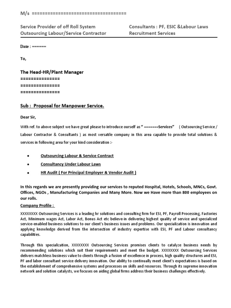 Template letter of proposal to supply materials and labour. The Manpower suppliers are required to downoad and submit their offers in two-bid Qualification Commercial format for providing services for hiring the outsourced manpower as per following schedule. Letter Regarding Shortage of Manpower.
